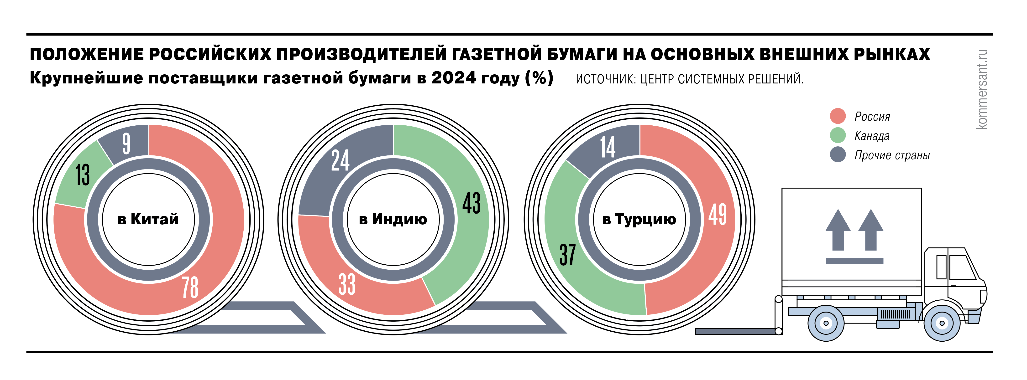В мире в число основных импортеров газетной бумаги входят страны Европы (37 %), Индия (13 %), США (12 %) и Китай (7 %). Для российских производителей после 2022 г. и прекращения поставок в недружественные страны ключевыми направлениями для экспорта остались Китай, Индия и Турция. Там отечественные поставщики занимают существенную часть рынка. По состоянию на 2023 год доля российских компаний в импорте Китая превысила 80 %, а в общем объеме потребления газетной бумаги в стране – 31 %.