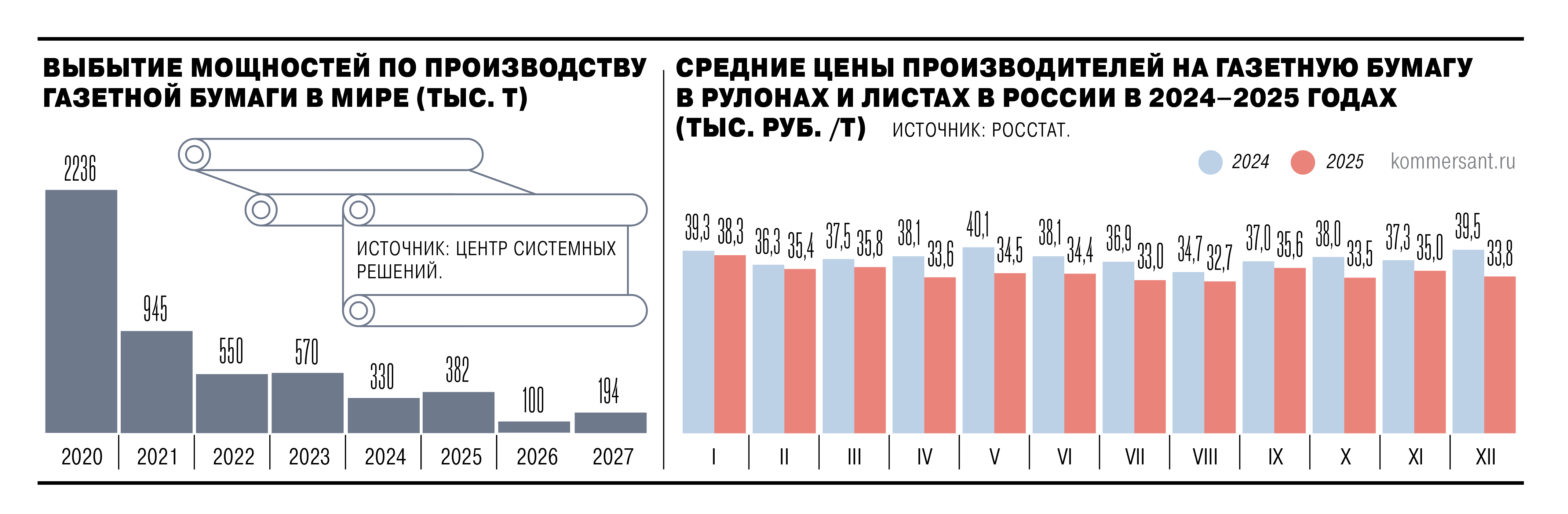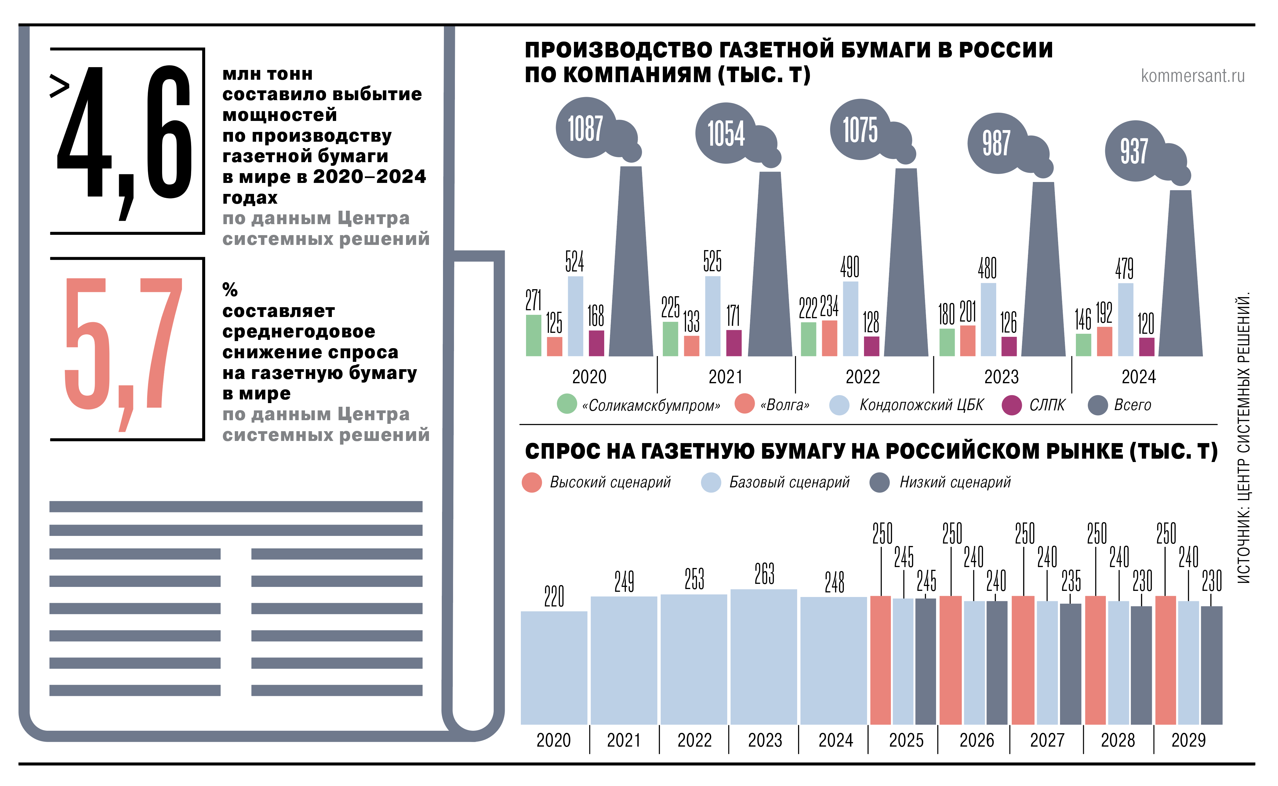 По данным Центра системных решений (ЦСР), последние десять лет мировой рынок газетной бумаги падает со скоростью около 7 % в год, опережая остальные сегменты целлюлозно-бумажной промышленности (ЦБП). Объем мощностей за 2020–2024 гг. сократился более чем на 4,6 млн т. За последние три года динамика замедлилась, но закрытия предприятий продолжаются. По оценке ЦСР, в 2025 г. будут сокращены мощности объемом 380 тыс. т, в 2026–2027 гг. – по 100–200 тыс. т.