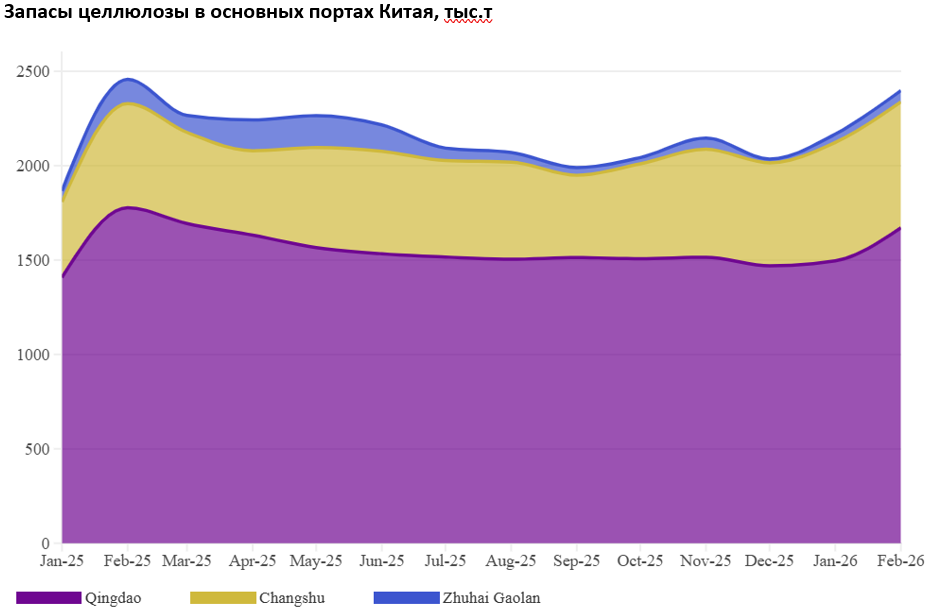 Однако покупатели предложили другой подход. Сезонно высокие месяцы спроса на целлюлозу и бумагу на китайском рынке уже позади, о чем свидетельствует традиционное пополнение запасов в течение нескольких недель после новогодних праздников. Импорт целлюлозы в Китай уже вырос примерно на 1,8 миллиона тонн в 2025 году, а импорт в январе и феврале оставался высоким, что свидетельствует о том, что запасы целлюлозы в основном переходили от производителей к покупателям в течение четвертого и первого кварталов.