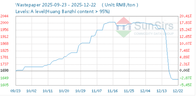 Основным фактором снижения явилось падение цен на макулатуру: с 1966 юаней/тонну 12 декабря до 1642 юаней/тонну 22 декабря 2025 года.