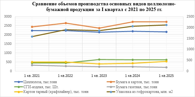 В I квартале 2025 г. по сравнению с аналогичным периодом 2024 г. выросли объемы производства бумаги и картона – на 0,2 %, тем не менее, по сравнению с базовым 2021 г., рост составил 111,4 %. Тарный картон (крафт-лайнер) прибавил в I квартале 2025 г. по сравнению I квартале 2024 г. 24,2 %, а по сравнению с I кв. 2021 г. – 6,5 %. Существенно выросли за рассматриваемый период объемы производства ящиков и коробок из гофрированного картона: к I кв. 2024 г. – на 3 %, к I кв. 2021 г. – на 33 %. Однако, производство целлюлозы незначительно снизилось как к I кв. 2024г. (-1,6 %), так и к I кв. 2021 г. (-3,3 %).