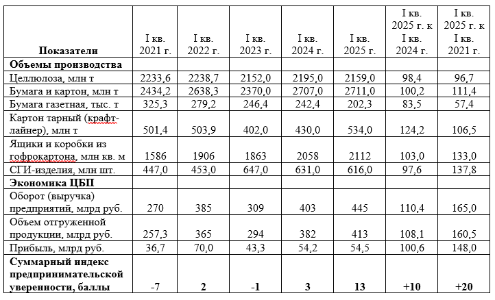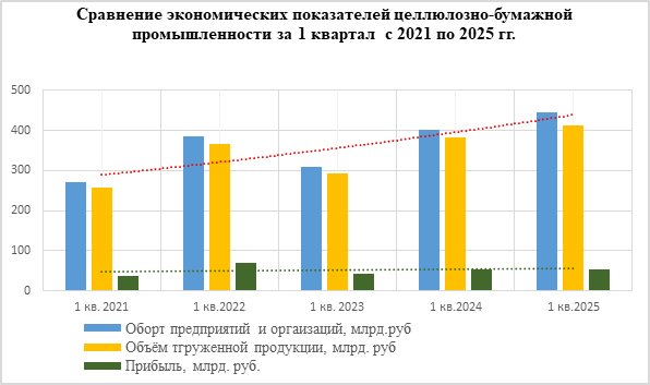 В I квартале 2025 г. улучшилось экономическое состояние отрасли – выручка увеличилась на 10,4% к I кварталу предыдущего года, а к I кварталу 2021 г.– на 65,0 %. Объем отгруженной продукции целлюлозно-бумажных предприятий, соответственно, на 8,1 и на 60,5 %.
