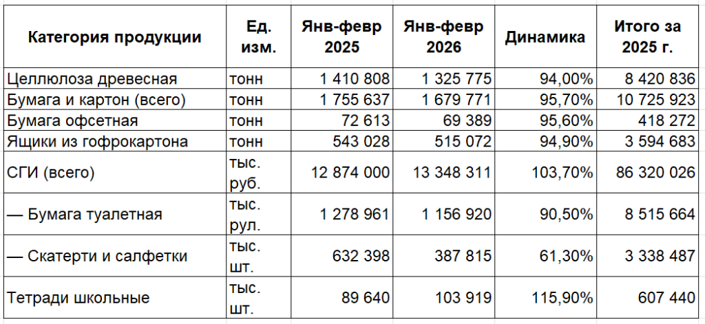 Данные промышленного производства за январь и февраль 2026 года указывают на закономерное охлаждение в сырьевых сегментах ЦБП при сохранении высокой активности в потребительском секторе. Суммарный индекс выпуска бумаги и бумажных изделий за два месяца составил 88,5%, что отражает адаптацию мощностей к текущему уровню спроса и продолжающуюся трансформацию логистических цепочек.
