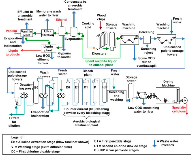 Из-за высокого уровня непрореагировавшего лигнина (высокого числа каппа) при производстве продуктов с высокой вязкостью наблюдается изначально более высокий уровень ХПК по сравнению с производством бумажной целлюлозы. Повышенный уровень AOX (адсорбируемых органических галогенов) обусловлен использованием диоксида хлора на стадиях отбеливания.