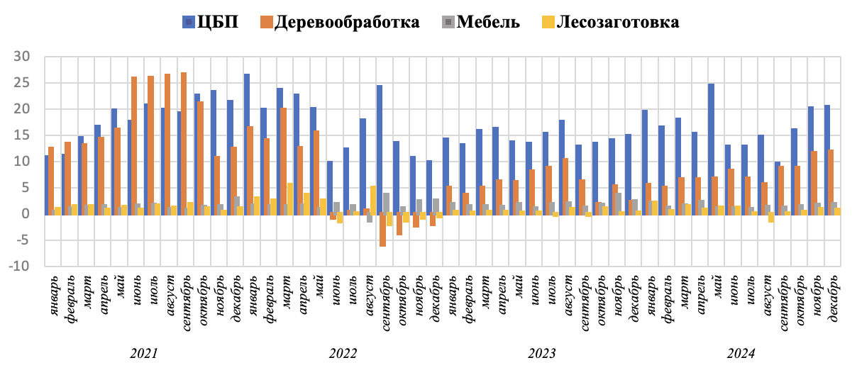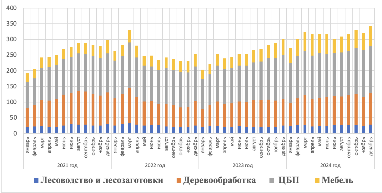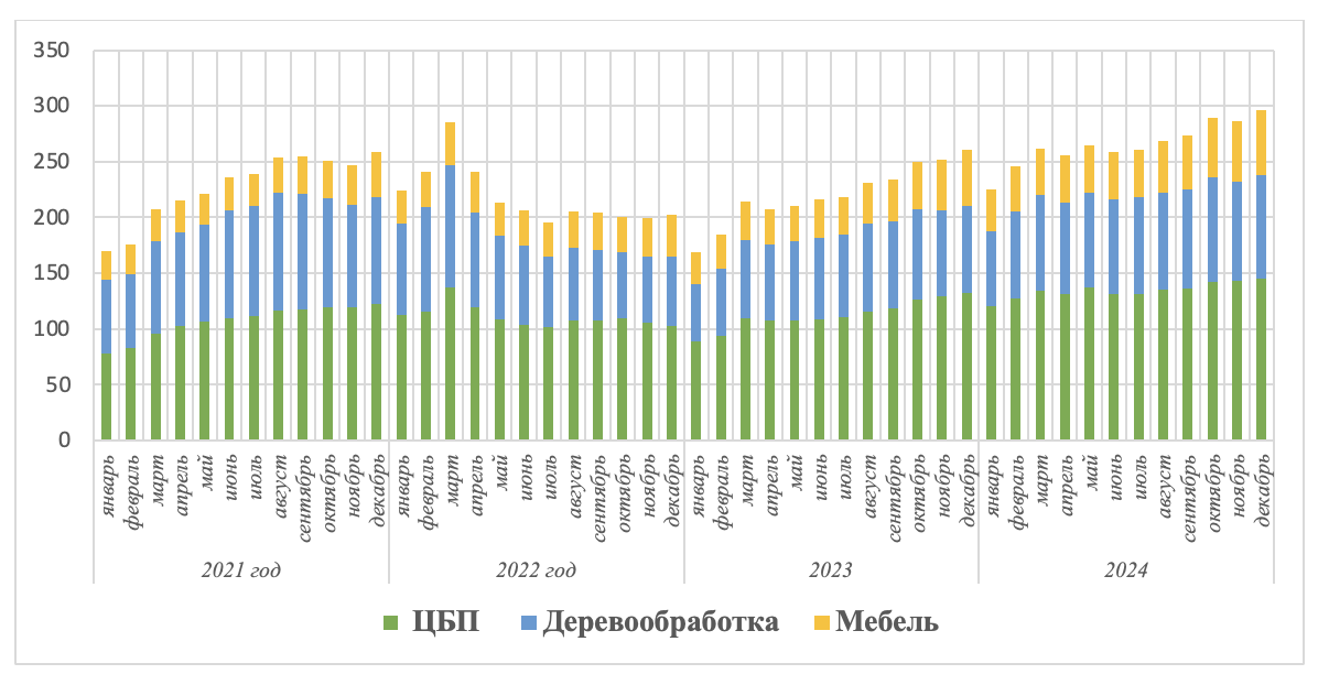 Среднемесячная заработная плата работников лесного комплекса в 2024г. по отношению к 2021г. (это более показательное сравнение) во всех отраслях значительно увеличилась. Наиболее заметный рост зарплаты наблюдался на предприятиях целлюлозно-бумажной промышленности - на 57,5%, и в производстве мебели – 56,0%. Резкий рост средних заработных плат объясняется попыткой привлечения на целлюлозно-бумажные компании дополнительных работников из-за нарастающего дефицита профессиональных кадров и высокой межотраслевой конкуренции на рынке труда за привлечение на производство квалифицированных кадров.