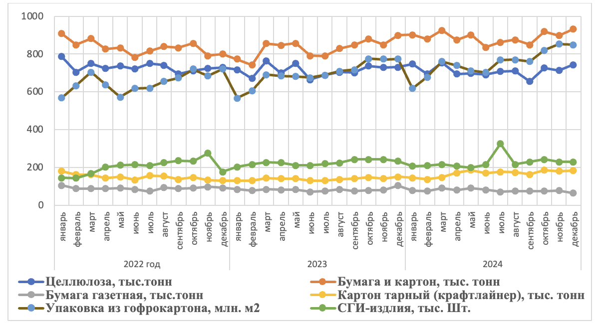 Рис. 3. Динамика изменения объёмов производства основных видов продукции целлюлозно-бумажной промышленности.