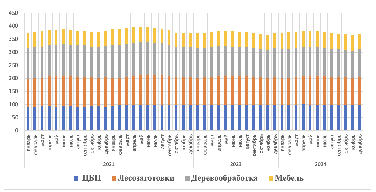Так, общее количество рабочих мест на предприятиях лесопромышленного комплекса (кроме малых предприятий) в целом к концу 2024 года по отношению к аналогичному периоду 2023г. уменьшилось на 0,2%, однако к концу 2021 году снижение количества рабочих мест, соответственно, составило 1,6%. И это при критичном кадровом голоде во всех отраслях лесного комплекса, где дефицит квалифицированных работников превышает 30%. Так, в целлюлозно-бумажной промышленности в 2024г. количество рабочих мест незначительно выросло - на 0,5% по отношению к 2023г., но заметно увеличилось к 2021г. - на 7,8%. Следует отметить, что российская ЦБП является наиболее привлекательной для потенциальных работников отраслью лесного комплекса, так как там наиболее высокая среднемесячная заработная плата и высокая автоматизация производства, что делает условия труда достаточно комфортными.