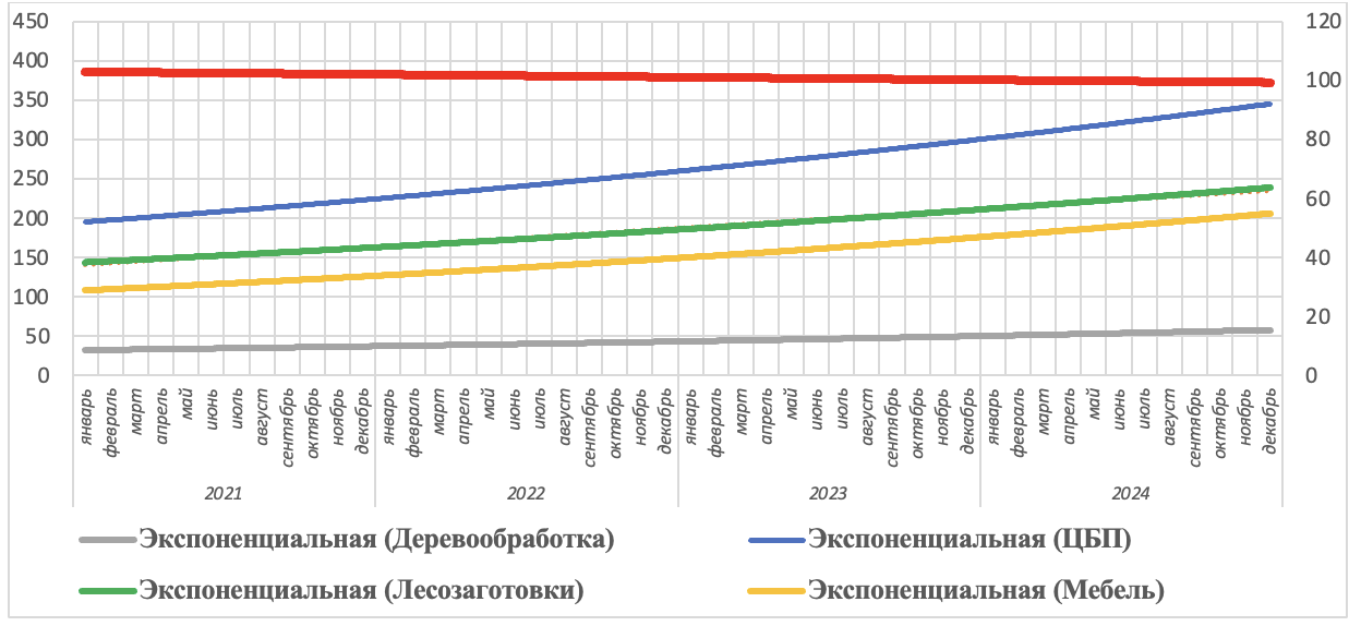 Анализ экономических показателей за 2024г. по сравнению с аналогичным периодом 2021, 2022 и 2023г.г. показал, что изменения суммарной прибыли предприятий лесного комплекса происходили разновекторно и скачкообразно. В 2024 году по сравнению с 2021 годом прибыль в целом по лесному комплексу уменьшилась на 26,7%, в том числе на предприятиях целлюлозно-бумажной промышленности – на 5,5%. Тем не менее, в прошедшем году суммарная прибыль в лесном комплексе сделала существенный скачок в сторону увеличения по сравнению с 2023 годом – на 18,4%, причём в целлюлозно-бумажной промышленности суммарная прибыль увеличилась на 15%.