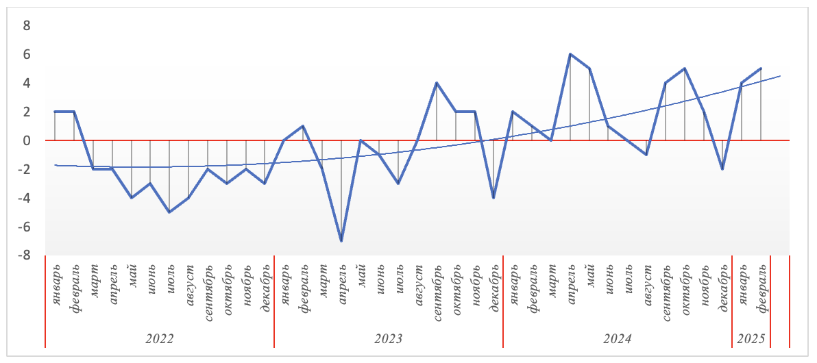 В январе-феврале 2925 года индекс предпринимательской уверенности вырос на 9 баллов по отношению к декабрю 2024 года.