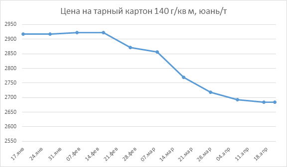 Спрос на упаковку остается слабым из-за сезонного спада и торговых ограничений, что снижает объемы экспортных заказов. Упаковочные компании закупают сырье минимальными партиями, ожидая дальнейшего падения цен. Ожидается, что майские праздники усилят эту тенденцию.