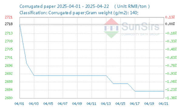 По данным аналитической системы SunSirs, средняя цена на 140-граммовую гофробумагу в Китае 17 апреля 2025 г. составила 2 684 юаня за тонну, что на 0,3 % ниже показателя от 13 апреля. Тенденция к снижению сохраняется, несмотря на небольшой рост цен на макулатуру – ключевое сырье для производства. В провинции Чжэцзян стоимость макулатуры класса А увеличилась на 0,4%, достигнув 1 488 юаней за тонну.