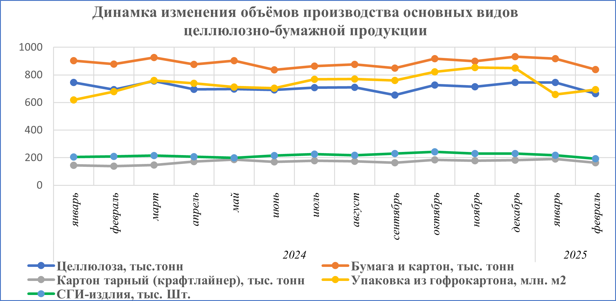 Данные Росстата за первые 2 месяца текущего года свидетельствуют о снижении практически всех производственных показателей в целлюлозно-бумажной промышленности. Так, объём производства целлюлозы и древесной массы в феврале 2025г. по сравнению с декабрём 2024г. снизился на 10,7%, бумаги и картона в целом – на 10%, крафт-лайнера – на 8,9%, тест-лайнера – на 12,9%, ящиков и коробок из гофрокартона – на 18,5%, СГИ (полотенца санитарно-гигиенические и т.д.) – на 16,9%.