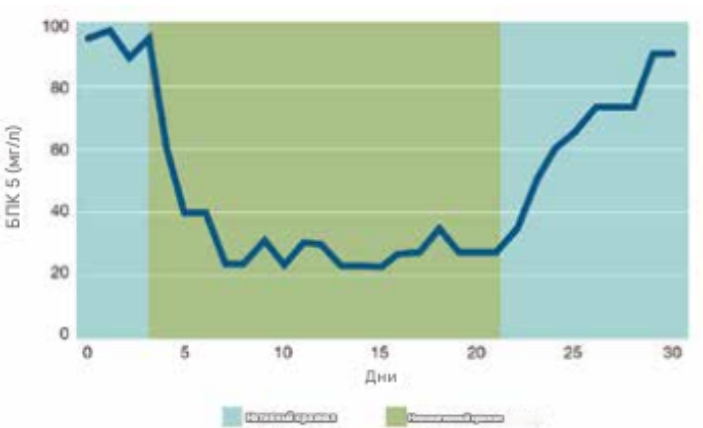 График 2. Снижение БПК сточных вод с помощью катионного крахмала при поверхностной проклейке. |