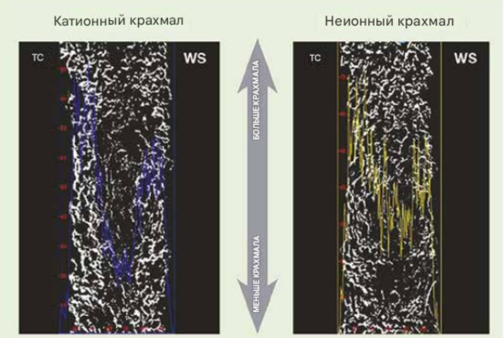 Доказано, что при одинаковом уровне вязкости низкокатионный крахмал имеет тенденцию к меньшему проникновению листа при нанесении на поверхность бумаги по сравнению с неионным крахмалом. Это происходит благодаря взаимодействию низкокатионного крахмала с анионно заряженными волокнами на бумажной поверхности, что способствует удержанию большего количества крахмала на листе (Рисунок 1). Это дает значительно большую прочность поверхности, что позволяет уменьшить потребление крахмала для покрытия на 30% без снижения прочности поверхности.