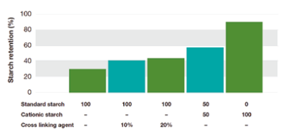 Наиболее значимым экономическим преимуществом использования катионных крахмалов для поверхностного покрытия является возможность замены волокна на наполнители и сокращения общего потребления крахмала для покрытия. Низкокатионные крахмалы, присутствующие в разрушенных волокнах, способствуют увеличению удержания наполнителя, что ведет к росту уровня наполнителя. Снижая дозировку свежего наполнителя, фабрики могут достичь определенной экономии. Например, одна скандинавская фабрика по производству тонкой бумаги зафиксировала рост уровня наполнителя на 1–2%, что позволило сократить использование свежего наполнителя на 5%, что привело к значительной экономии материалов в год.