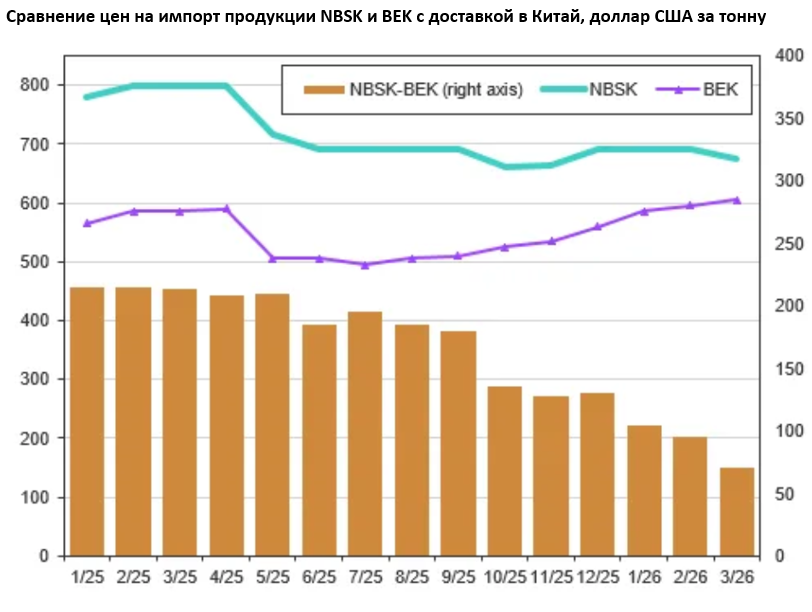 Разница между рыночными ценами на беленую крафт-целлюлозу из северных хвойных пород (NBSK) и беленую эвкалиптовую целлюлозу (BEK) упала ниже 100 долларов за тонну, достигнув самого низкого уровня с середины 2024 года и установилась на уровне значительно ниже разницы в себестоимости производства NBSK по сравнению с BEK. Сужение разницы должно побудить покупателей потреблять больше хвойной целлюлозы или, по крайней мере, запасаться BSK, пока есть такая возможность.